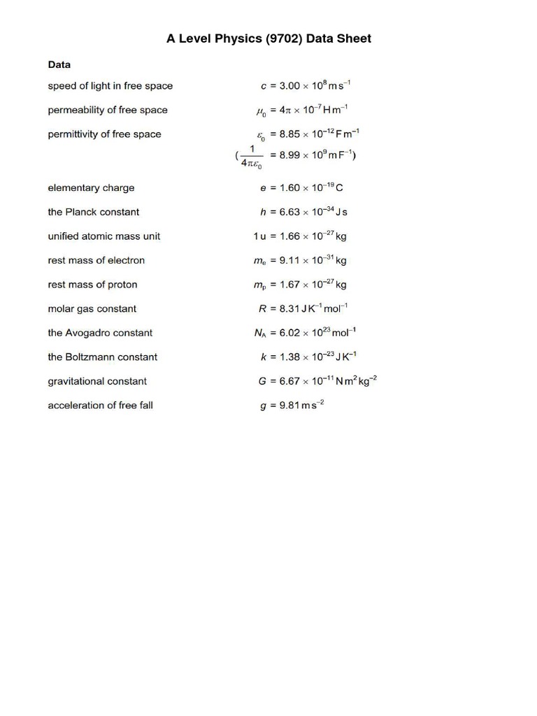 A-level Physics data and formulae For use in exams from the June 2017 Series onwards Version 12 1. A level physics data sheets. Write your answers in the spaces provided in this booklet.